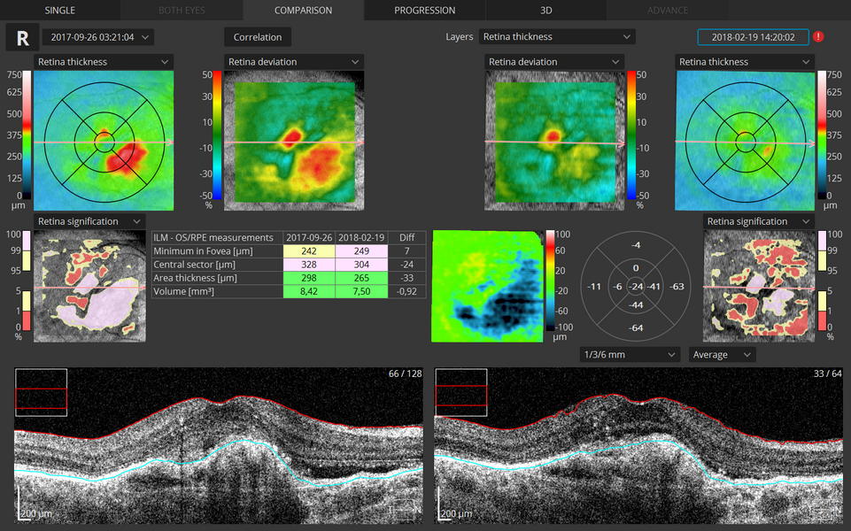 Η ικανότητα εκτίμησης του πάχους του αμφιβληστροειδούς και της αντικειμενικής καταγραφής του ενδοαμφιβληστροειδικού οιδήματος καθιστούν την εξέταση πολύ χρήσιμη στην παρακολούθηση του διαβητικού οιδήματος της ωχράς.