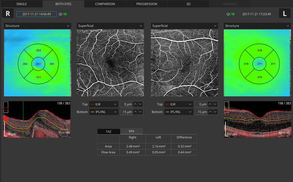 Τέλος πραγματοποιεί ταχύτατη και αναίμακτη αγγειογραφία του αγγειακού δικτύου του οφθαλμού υποκαθιστώντας σε πολλές περιπτώσεις παλαιότερες επεμβατικές αγγειογραφίες που γινόντουσαν με τη χρήση ενδοφλέβιων σκιαγραφικών ουσιών.