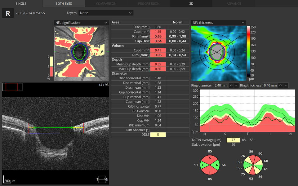 Επιπλέον, η περιγραφή της ανατομικής βλάβης του οπτικού νεύρου στο γλαύκωμα, όπως αποδίδεται με την OCT, είναι ένα πολύ σπουδαίο εργαλείο για την πρώιμη διάγνωση της νόσου, τη βαθμονόμηση και εξέλιξή της. Τα ευρήματα της εξέτασης σε συνδυασμό με τα δεδομένα από την Αυτόματη Περιμετρία (Οπτικά Πεδία) αποτελούν το κλειδί για την εκτίμηση των γλαυκωματικών βλαβών.