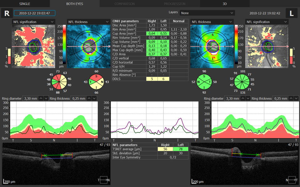 Επιπλέον, η περιγραφή της ανατομικής βλάβης του οπτικού νεύρου στο γλαύκωμα, όπως αποδίδεται με την OCT, είναι ένα πολύ σπουδαίο εργαλείο για την πρώιμη διάγνωση της νόσου, τη βαθμονόμηση και εξέλιξή της. Τα ευρήματα της εξέτασης σε συνδυασμό με τα δεδομένα από την Αυτόματη Περιμετρία (Οπτικά Πεδία) αποτελούν το κλειδί για την εκτίμηση των γλαυκωματικών βλαβών.