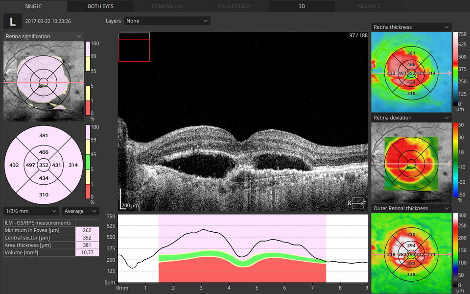 Η ικανότητα εκτίμησης του πάχους του αμφιβληστροειδούς και της αντικειμενικής καταγραφής του ενδοαμφιβληστροειδικού οιδήματος καθιστούν την εξέταση πολύ χρήσιμη στην παρακολούθηση του διαβητικού οιδήματος της ωχράς.
