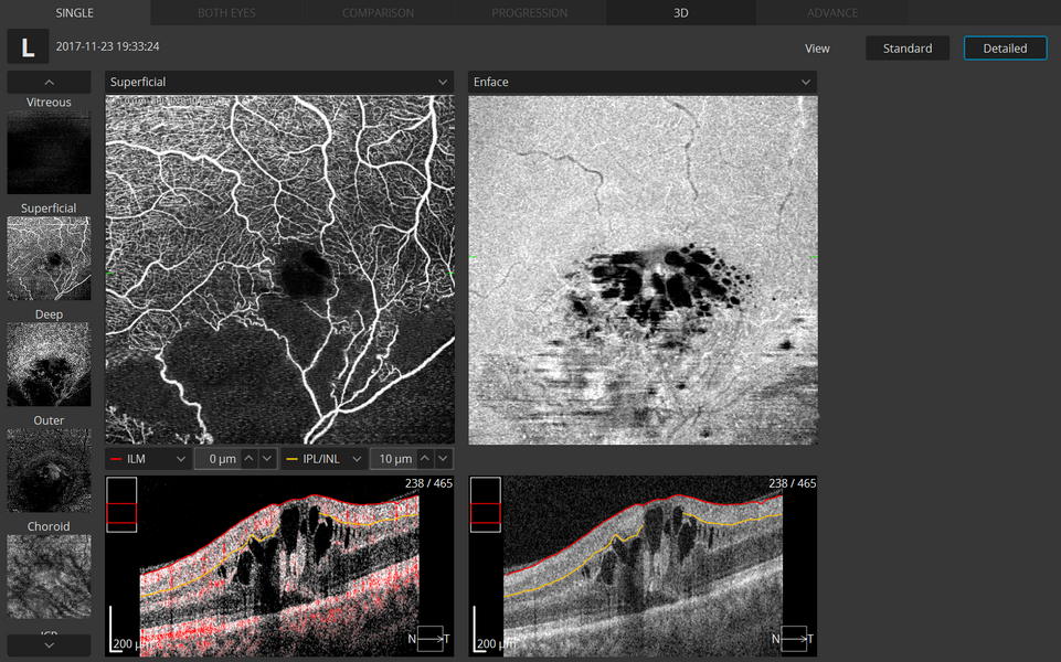 Τέλος πραγματοποιεί ταχύτατη και αναίμακτη αγγειογραφία του αγγειακού δικτύου του οφθαλμού υποκαθιστώντας σε πολλές περιπτώσεις παλαιότερες επεμβατικές αγγειογραφίες που γινόντουσαν με τη χρήση ενδοφλέβιων σκιαγραφικών ουσιών.
